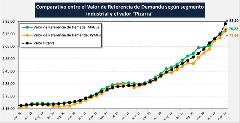 En el gráfico de abajo se subdivide la capacidad de pago o valor de referencia de demanda, entre las denominadas Megas y Grandes Empresas (MyGEs) y Pequeñas y Medianas Empresas (PyMEs).
