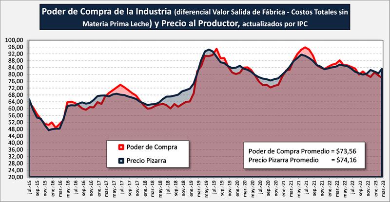 Viendo el precio pizarra liquidado y comparado con la capacidad de pago promedio de la industria, actualizada por IPC, para un período más prolongado, puede observarse que en el largo plazo (salvo oscilaciones temporales) los valores promedio convergen: $ 74,16 por litro de Precio Pizarra y $ 73,56 por litro de Poder de Compra.