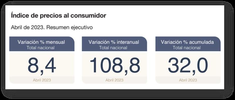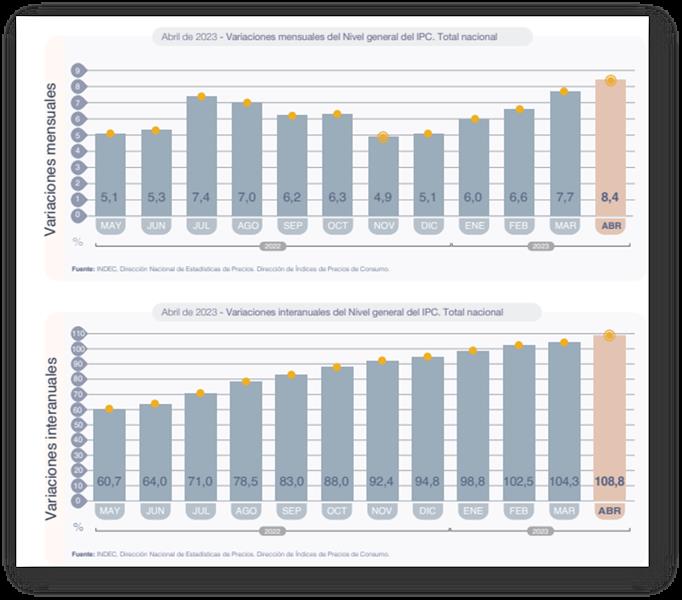 El nivel general del Índice de precios al consumidor (IPC) representativo del total de hogares del país registró en abril una variación de 8,4% con relación al mes anterior, acumuló un 32,0% en el primer cuatrimestre del año y la variación interanual fue del 108,8%.