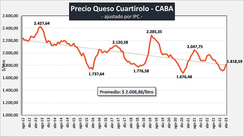 En el caso del queso cuartirolo mantiene también una tendencia decreciente en la serie de 10 años. El precio de febrero está 9,5% por debajo de la media y 25,1% por debajo del máximo alcanzado en 2013.