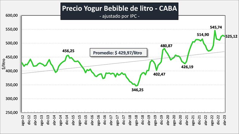La situación de los yogures bebibles de litro es diferente, sostienen el nivel de consumo de la categoría, y sus precios se ajustaban más en sintonía con el ritmo inflacionario, con algunos altibajos. El precio actual está 22,1% encima de la media de la serie. Lamentablemente tiran para abajo el promedio del mix, ya que su aumento de ventas no fue acompañado por las ventas de yogures en pote, postres y flanes que tienen un mayor valor por litro equivalente.