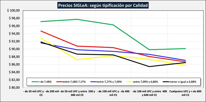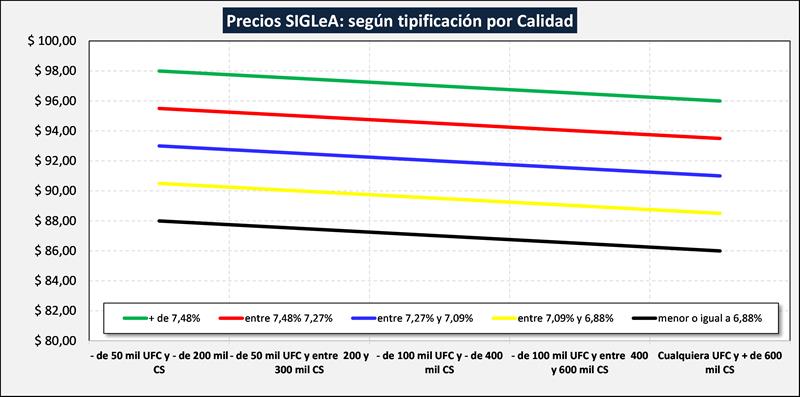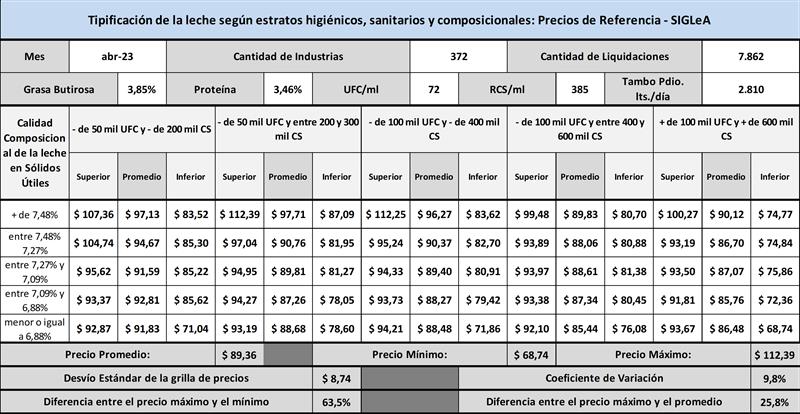 En el cuadro de tipificación, la leche comercializada se divide en 25 estratos según composición y calidad higiénico-sanitaria y, dentro de cada estrato, se muestra un promedio ponderado del precio del total de esos litros y además un promedio ponderado del 20% superior e inferior de los precios.