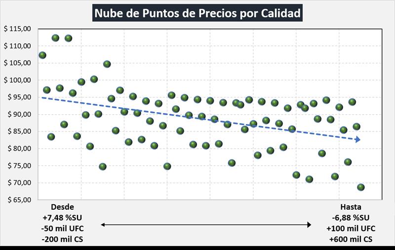 Si elaboramos una nube de puntos con los diferentes precios disponibles en función a las calidades, podemos observar que se da una pendiente descendente de precios a medida que es menor la calidad integral de la leche, pero esa pendiente podría ser mucho más pronunciada si se pretende mejorar/incentivar la mejor calidad de leche.
