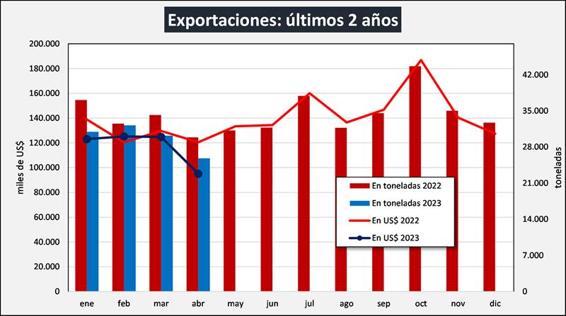 La variación intermensual de las exportaciones fue de -14,5% en volumen y de -23,7% en valor (abr/23 vs. mar/23). La variación interanual fue de -13,6% en volumen y -21,0% en valor (abr/23 vs. abr/22). En ambas comparaciones se puede visualizar la caída en volúmenes y en precios.
