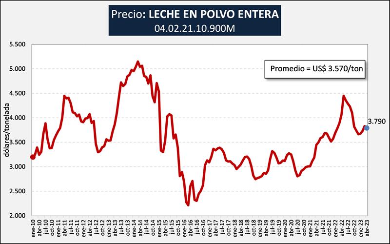 En el gráfico siguiente se puede observar la evolución del precio de la Leche en Polvo Entera en bolsas de 25 kgs. con el nomenclador Común Arancelario 04.02.21.10 900M actualizado hasta el mes de abril de 2023: