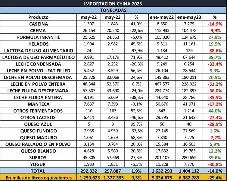 CHINA: importaciones de productos lácteos a mayo de 2023 21/6/2023