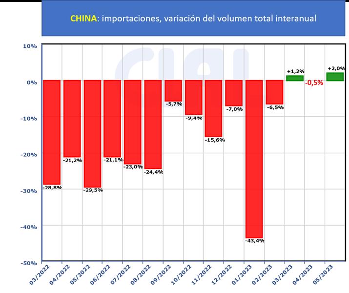Estas bajas en las compras de China responden en principio, a una mayor producción local, a altos stocks generados en las grandes compras de 2021, a las dificultades logísticas que implicaron el cierre de algunas ciudades por rebrotes de Covid, efectos colaterales de la Guerra en Ucrania y el proceso inflacionario que se viene dando en todas las economías mundiales. Se espera que la situación se revierta en el segundo semestre de 2023 y se restablezca un volumen más importante de compras.