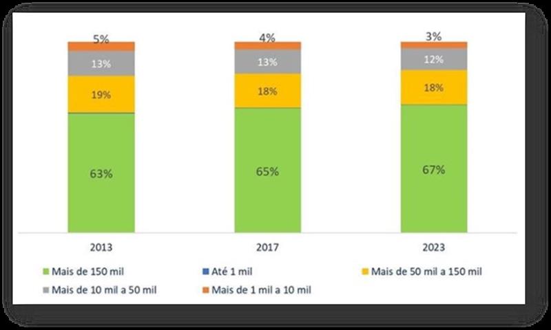El gráfico muestra que las industrias más grandes (aquellas con un volumen comprado de más de 150.000 litros diarios) representaron, en 2013, el 63% de la compra total de leche formal en el país y ahora, en el primer trimestre de 2023, por 67% del volumen total - una evolución bastante modesta en la participación de estas grandes industrias.