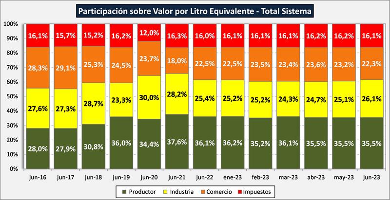 La participación del productor en el total del sistema fue para junio de 2023 del 35,5%, igual que el mes anterior, bastante por encima de la media del 32,0%. Se produjo una leve suba de 0,2 punto en los valores finales de mercado interno y una baja de 1,5 puntos porcentuales en la participación de los valores de mercado externo, colocándola 0,4 puntos por encima de la media histórica de la serie disponible (64,1%). La participación del productor sobre el valor de salida de fábrica (precio al que vende la industria) fue de 57,7%, 0,9 puntos debajo del mes pasado y 4,1 puntos encima del promedio de la serie (53,6%).