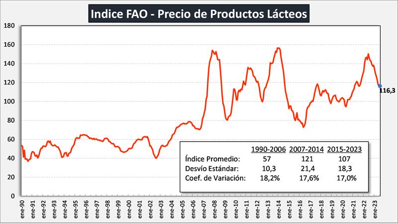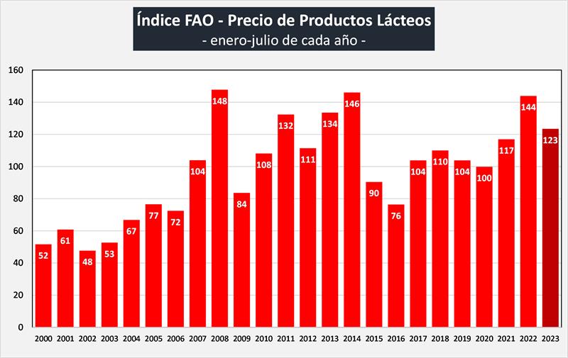 Por su parte el gráfico siguiente muestra el valor promedio del período enero-julio de cada año del índice de precios de los lácteos de FAO de los últimos 24 años (2000-2023):