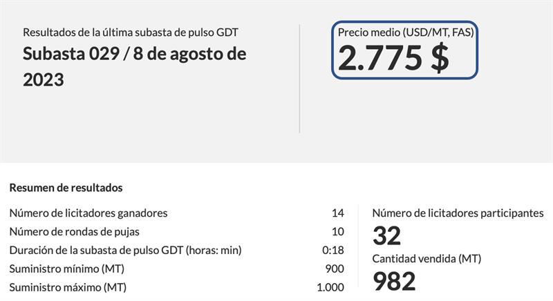 La Subasta Nº 029 se ha llevado ha cabo en el día de hoy, martes 8 de agosto, donde el precio promedio obtenido para la LPE ha sido de 2.775 US$/t, lo que implica una caída del 7,5% respecto a lo publicado en la última GDT pulse y una disminución de 3,1% respecto al último evento del GDT (2.864 US$/t).