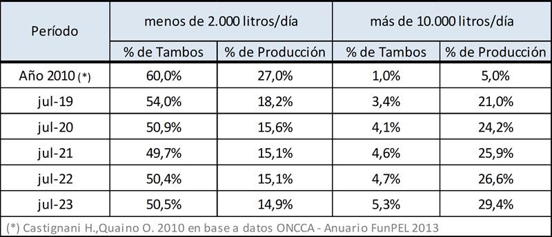 Puede verse en el cuadro siguiente al comparar con datos disponibles del año 2010, que en un extremo disminuye la participación tanto en cantidad de tambos como en el volumen de producción de las unidades productivas de menos de 2.000 litros diarios y en el otro extremo de la estratificación, se incrementa la participación de las unidades de más de 10.000 litros diarios.