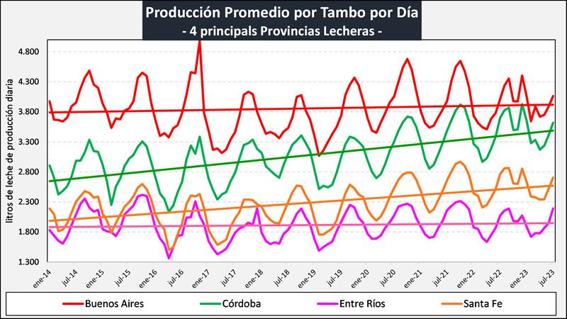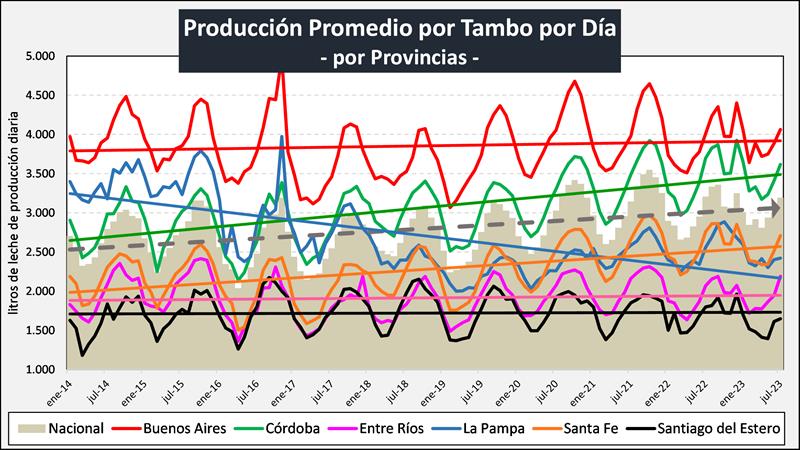 Sobre la base de la producción mensual y la cantidad anual de tambos (SENASA), podemos inferir el tamaño del tambo promedio, unos 3.285 litros de leche diarios para julio de 2023, un 3,5% más que el año anterior. Si evaluamos su comportamiento en el tiempo, a pesar de la disminución en el número de unidades productivas y en el número de vacas, el tambo promedio presenta en el período 2009-2023 una tasa de crecimiento acumulada anual del 3,1%, lo que permite el sostenimiento e incluso aumento de los niveles productivos agregados a nivel país.