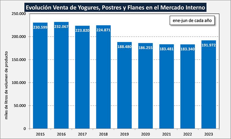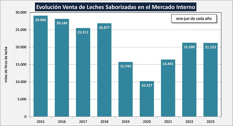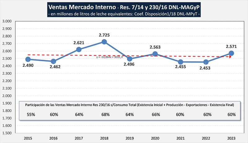 En el gráfico siguiente se puede ver la evolución de las ventas que captura la resolución (en este caso para enero-junio de cada año), medida en litros de leche equivalente y el porcentaje que esas ventas representan del total de leche consumida en el mercado interno según el Balance Lácteo, quedando fuera de análisis alrededor del 40% de las ventas de productos lácteos en el mercado doméstico.