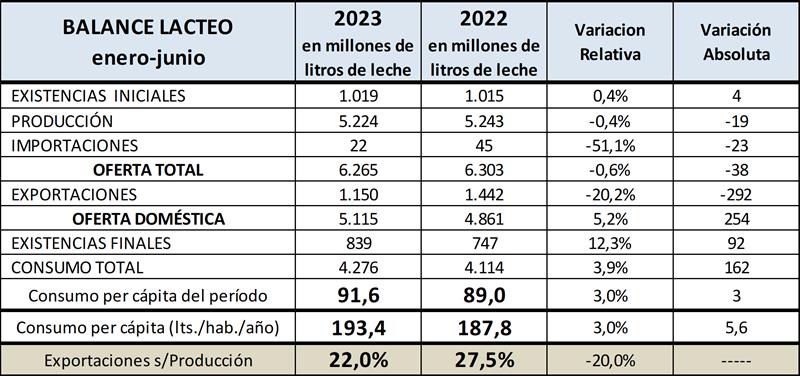 Si hacemos la comparación interanual, en el primer semestre de 2023 respecto a igual período del año anterior, las ventas según datos basados en la resolución mencionada, subieron 3,1% en volumen de productos y 4,8% en litros de leche equivalentes. Situación que guarda un correlato con la caída de exportaciones en torno al 20% respectivamente y con un cuasi mantenimiento de stocks, sobre todo en los últimos cuatro meses.
