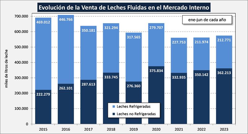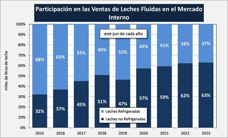 En los dos gráficos siguientes se presentan las ventas (en miles de litros) de los primeros seis meses del año de leches fluidas (refrigeradas y no refrigeradas), donde se puede ver por un lado el descenso generalizado en la venta de leches fluidas (al menos las que captura la Resolución 230) que se viene dando en los últimos 8 años, pero con una leve recuperación el último año. Por otra parte, en el gráfico que le sigue a éste se evidencia claramente cómo van creciendo en participación las leches no refrigeradas en detrimento de las leches refrigeradas.