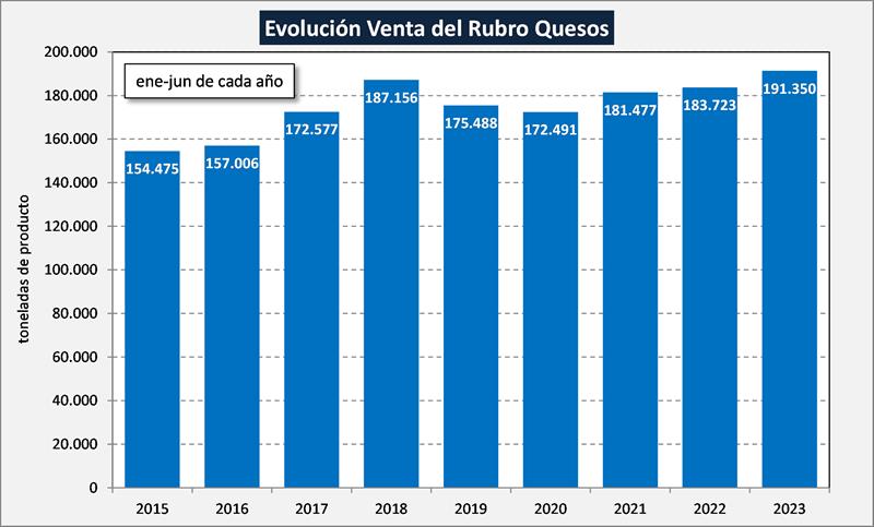 Para los quesos, el principal rubro de destino de elaboración y comercialización de productos, se da una situación similar a la descrita para los rubros anteriores, donde hay un leve crecimiento, pero sobre todos en los de menor valor unitario y/o agregado.