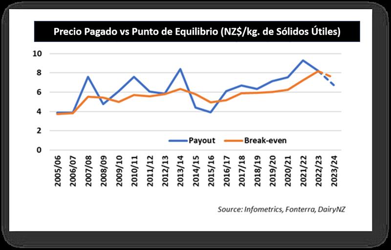 La última caída en el pago previsto de Fonterra equivale a una caída de 2.700 millones de dólares neozelandeses en los ingresos de los productores de leche, además de la caída de 2.000 millones de dólares neozelandeses de la temporada anterior. DairyNZ pronostica que los costos se reducirán ligeramente, reduciendo el punto de equilibrio a 7,51 dólares neozelandeses por kg MS para la temporada 2023/24 (US$ 4,47/Kg. de SU o US$ 0,33/litro de leche para 7,30% de SU), una mejora, pero aún mayor que los ingresos. La reducción del equilibrio se debe en parte a que los agricultores aplazan sus gastos para igualar el pago más bajo.