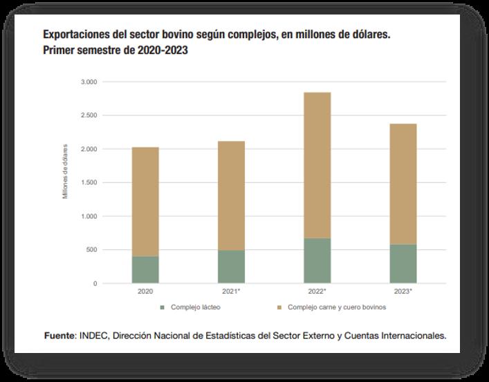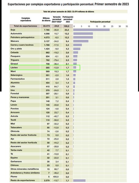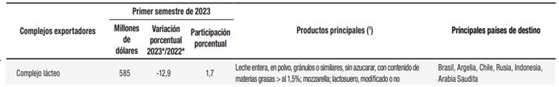 Las exportaciones del complejo lácteo en el período analizado fueron de 585 millones de dólares (1,7% del total) y disminuyeron 12,9% respecto al primer semestre de 2022. Las exportaciones de igual período del año pasado habían sido de 672 millones de dólares y representaban el 1,5% de las exportaciones totales.