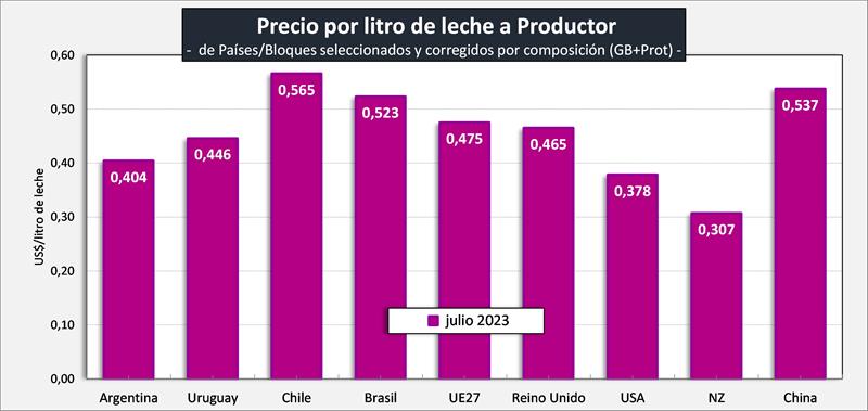 Observaciones: los precios en el gráfico de arriba han sido corregidos sólo por sólidos útiles (grasa butirosa y proteína) y no por el resto de atributos que hacen a la calidad higiénica y sanitaria, ni tampoco por tipo de cambio real bilateral con cada uno de esos países/bloques.
