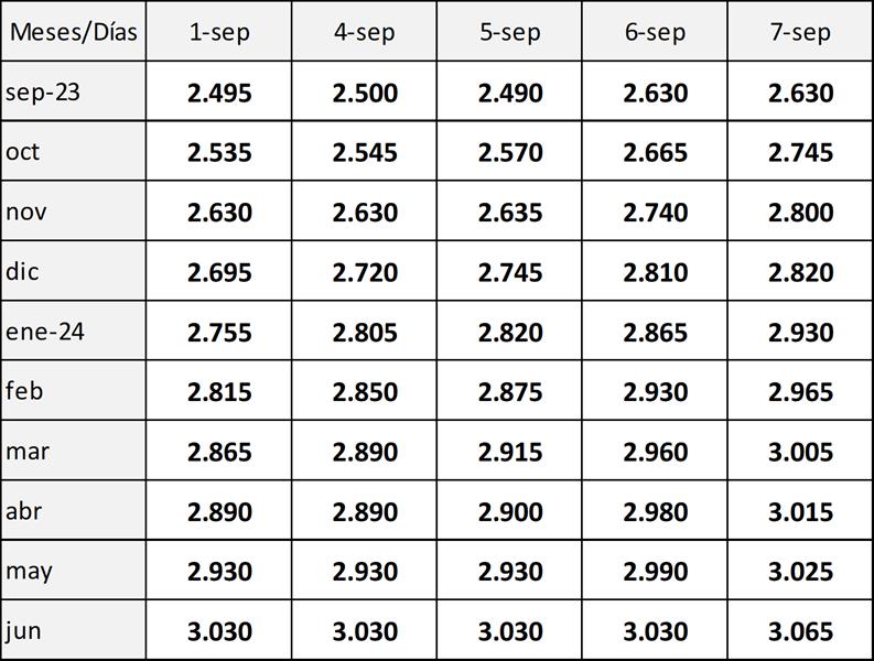 En los últimos días se viene observando una mejora en las cotizaciones para la Leche en Polvo Entera en el Mercado de Futuros de Nueva Zelanda y que se materializó en un aumento del 6% (US$ 2.702/ton.) en el evento N° 339 del pasado 5 de septiembre del Global Dairy Trade. Veremos en los próximos días si se consolida esta mejora en los precios internacionales en los próximos meses, luego de una importante caída que lleva ya ocho meses consecutivos y una tendencia decreciente desde marzo de 2022.