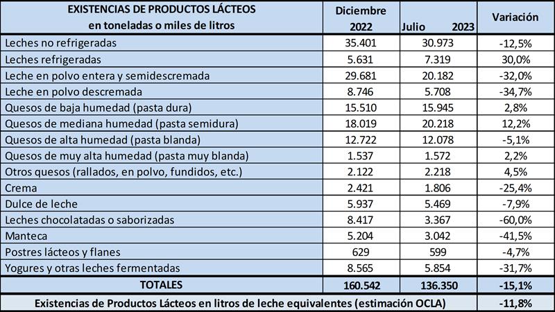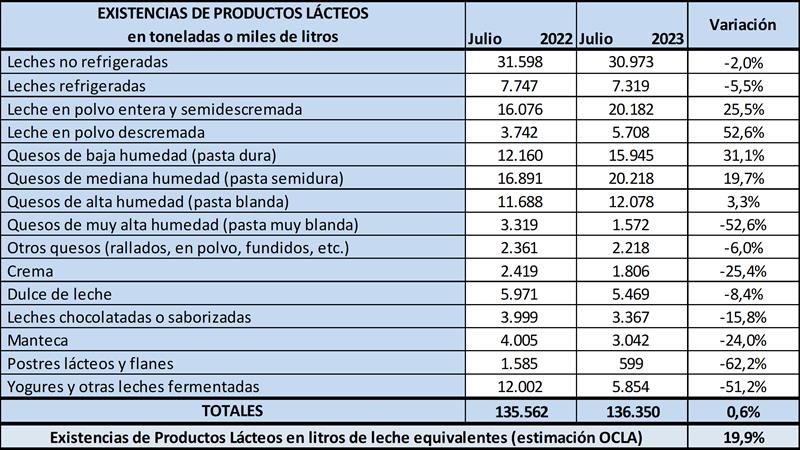 Existencias de Productos Lácteos – julio 2023 26/9/2023