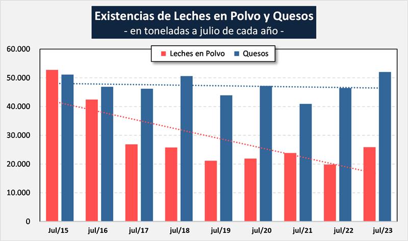 Evolución de las existencias de leches en polvo (enteras y descremadas) y quesos (duros, semiduros, blandos y muy blandos) a julio de los últimos 9 años: