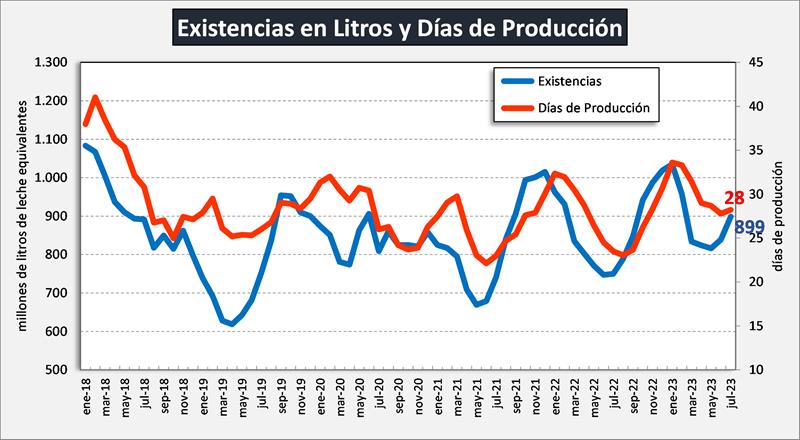 Evolución de las existencias medidas en litros de leche equivalentes y en días de producción de leche: