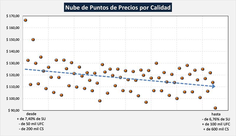 Si elaboramos una nube de puntos con los diferentes precios disponibles en función a las calidades, podemos observar que se da una pendiente descendente de precios a medida que es menor la calidad integral de la leche, pero esa pendiente podría ser mucho más pronunciada si se pretende mejorar/incentivar la mejor calidad de leche.