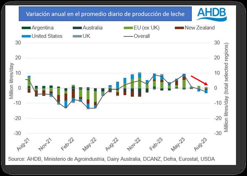 Nueva Zelanda, por el contrario, ha comenzado la temporada láctea muy por detrás de las cifras del año pasado, con una producción media diaria de 0,9 millones de litros (-2,1%) en agosto. Hay informes de que las condiciones climáticas extremas han afectado los pastos en todo el país, mientras que los productores están sintiendo la presión de los bajos precios, lo que ha resultado en un menor uso de concentrados y fertilizantes.