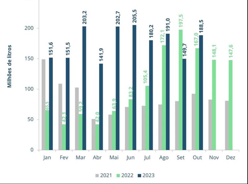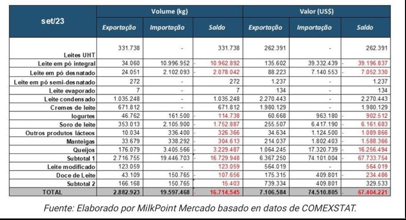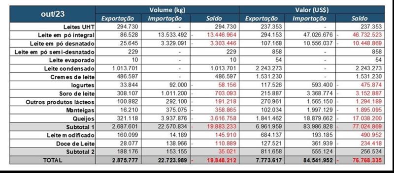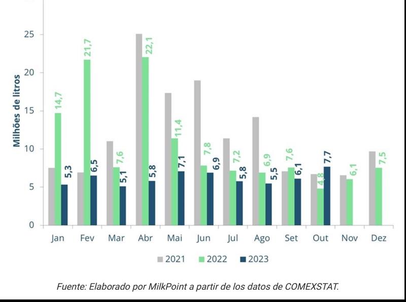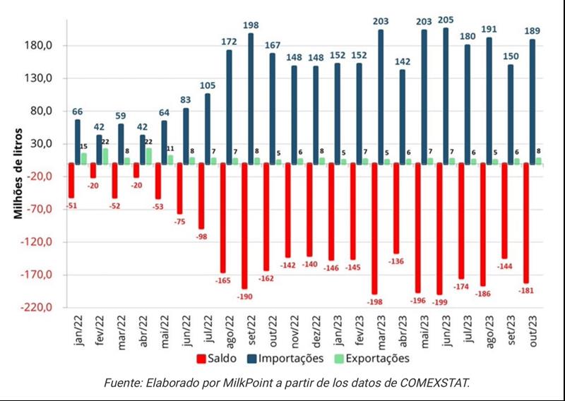 BRASIL: balanza comercial de lácteos 8/11/2023Para el mes de octubre, el saldo de la balanza comercial de lácteos volvió a ser más negativo en comparación con el mes anterior. Según datos publicados por la Secretaría de Comercio Exterior (SECEX), el saldo registrado en el último mes alcanzó los -181 millones de litros en equivalente-leche, una caída de 37 millones respecto a septiembre de 2023, como se puede observar en el gráfico 1. Gráfico 1. Saldo mensual de la balanza comercial brasileña de lácteos - equivalente de leche ![]() Las exportaciones registraron un incremento en el último mes. Con un volumen de 7,7 millones de litros en equivalente-leche exportados, octubre cerró con un avance mensual del 26,2% (+1,6 millones de litros) en las exportaciones, como muestra el gráfico 2. A pesar de este aumento porcentual, los volúmenes exportados permanecen en niveles bajos y también más bajos en comparación con el mismo período de 2022. De enero a octubre, Brasil exportó un 44,6% menos (-49,9 millones de litros) en comparación con el mismo período del año pasado. Gráfico 2. Exportaciones en equivalente-leche. ![]() En cuanto a las importaciones, tras el importante retroceso en septiembre, el volumen importado volvió a aumentar. Con un total de 188,5 millones de litros en equivalente-leche importados, el avance mensual fue del +26,9% (+38,8 millones de litros de leche), como muestra el gráfico 3. En la comparación anual, el volumen de octubre fue un 12,9% más alto frente a octubre/22. Y en los primeros 10 meses de este año, el volumen importado es un 77% mayor que en el mismo período de 2022. Gráfico 3. Importaciones en equivalente-leche. ![]() Analizando la variación para los principales productos importados, vemos que la leche en polvo entera, la principal categoría láctea importada por Brasil, presentó un avance en el mes de +23%. Las importaciones de quesos en octubre crecieron un 16% en comparación con septiembre. Y el principal destaque fue la categoría de leche en polvo descremada, que mostró una variación mensual del +58%. Otras categorías de menor participación en el volumen importado disminuyeron en el mes, como: yogures (-43%), suero de leche (-52%) y otros productos lácteos (-13%). Entre las categorías exportadas, la leche condensada tuvo una pequeña disminución en el mes (-2%), la crema de leche (-28%) y la leche UHT (-11%). El grupo de suero, que alcanzó un volumen récord de exportación en septiembre, tuvo un retroceso del -13%. Por otro lado, las exportaciones de quesos crecieron, con un aumento del 82% en comparación con septiembre. Las tablas 1 y 2 muestran los principales movimientos del comercio internacional de lácteos en los meses de septiembre y agosto de este año. Tabla 1. Balanza comercial de lácteos en octubre de 2023 ![]() Tabla 2. Balanza comercial de lácteos en septiembre de 2023 ![]() ¿Qué podemos esperar para los próximos meses? En los últimos meses, los precios internacionales de los lácteos, incluido el Mercosur (nuestros principales proveedores) han mostrado una recuperación, lo que ha disminuido la competitividad de precios del producto importado en comparación con el nacional. Además, la producción de leche en Argentina y Uruguay está empezando a disminuir, de acuerdo con el patrón estacional típico de producción en estos países, lo que debería dar lugar a una menor disponibilidad de productos para nuevas ventas. En este escenario, el volumen de lácteos importados por Brasil tiende a disminuir en los próximos meses. traducido por el OCLA a partir del artículo de Milkpoint