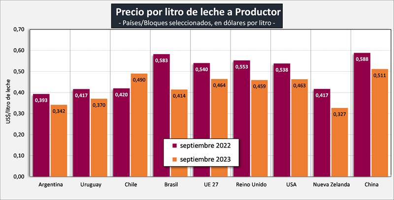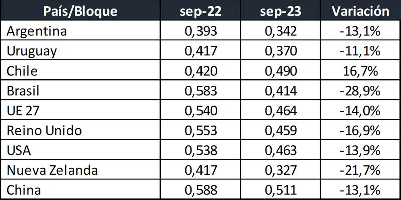 Fuentes: DNL-MAGyP, INALE, ODEPA, CEPEA/ESALQ USP, EMMO, AHDB, USDA y CLAL, respectivamente.