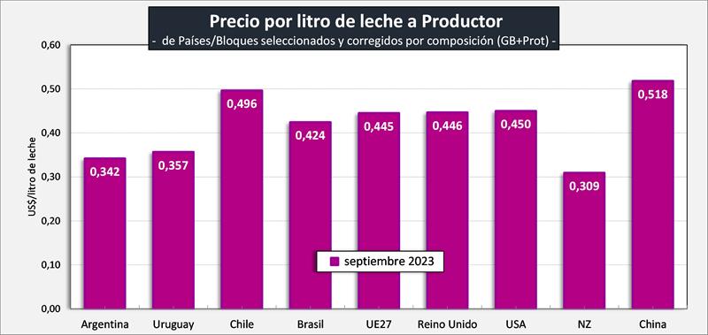 Observaciones: los precios en el gráfico de arriba han sido corregidos sólo por sólidos útiles (grasa butirosa y proteína) y no por el resto de atributos que hacen a la calidad higiénica y sanitaria, ni tampoco por tipo de cambio real bilateral con cada uno de esos países/bloques.
