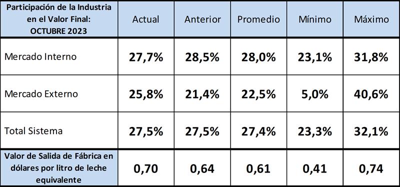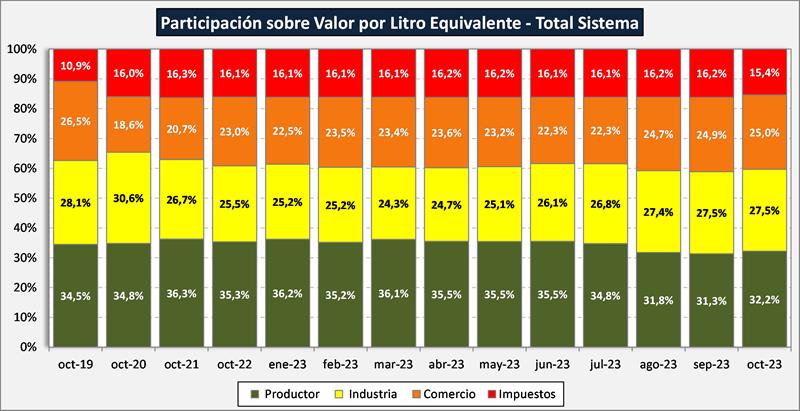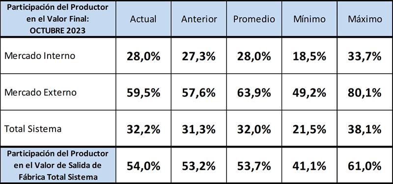 En el mes de octubre la participación general de productor en los valores de la cadena mejoró. La participación del productor en el total del sistema fue para octubre de 2023 del 32,2%, 0,9 puntos porcentuales por encima del mes anterior, y estuvo por encima de la media del 32,0%. Se produjo también una suba de 0,7 puntos en los valores finales de mercado interno (igualando a la media histórica) y subió 1,9 puntos porcentuales en la participación de los valores de mercado externo, colocándola 4,4 puntos por debajo de la media histórica de la serie disponible (63,9%). La participación del productor sobre el valor de salida de fábrica (precio al que vende la industria) fue de 54,0%, 0,8 puntos por encima del mes pasado y también 0,3 puntos por encima del promedio de la serie (53,7%).