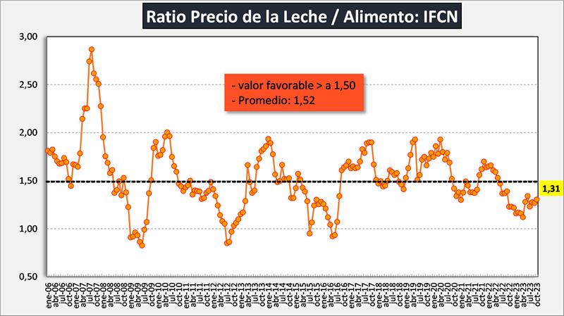 Este ratio es suministrado por MilkPoint: Precio de la Leche al Productor / Gasto de Alimentación.
