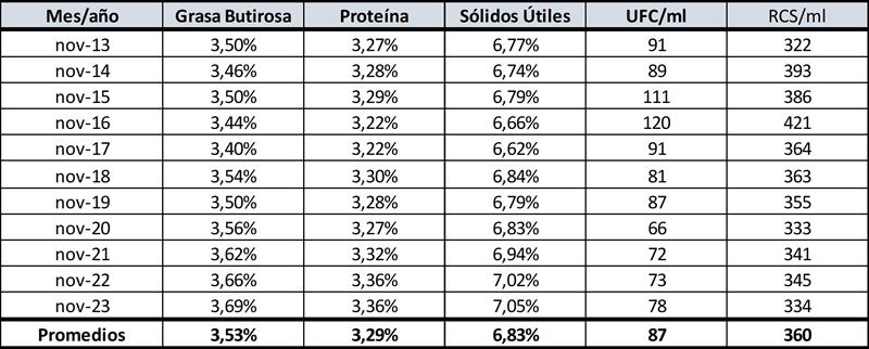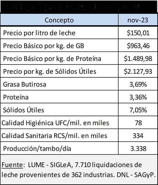 Calidad de Leche – noviembre 2023 18/12/2023Leche de Referencia ![]() Art. 9° - Resolución N° 229/2016 SIGLeA en términos del art. 2° de la Resolución Conjunta N° 739 y N° 495/2011. Precio Promedio mes actual ![]() Evolución de la Calidad de Leche ![]() Para ver toda la información de calidad, ingrese al siguiente enlace: https://www.ocla.org.ar/contents/newschart/portfolio/?categoryid=13 elaborado por el OCLA con datos de la DNL-SAGyP