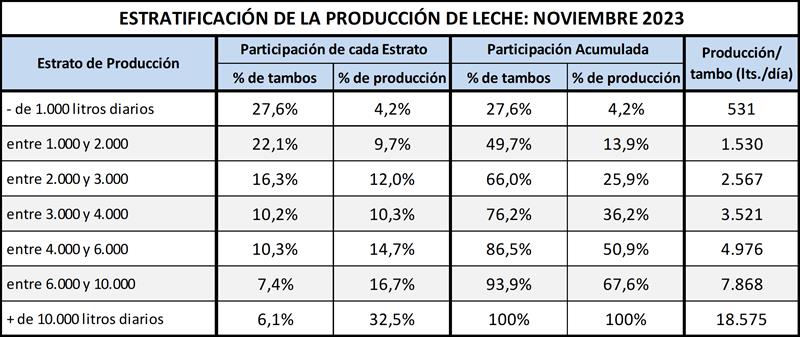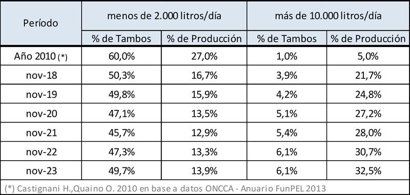 Puede verse en el cuadro siguiente al comparar con datos disponibles del año 2010, que en un extremo disminuye la participación tanto en cantidad de tambos como en el volumen de producción de las unidades productivas de menos de 2.000 litros diarios y en el otro extremo de la estratificación, se incrementa la participación de las unidades de más de 10.000 litros diarios.