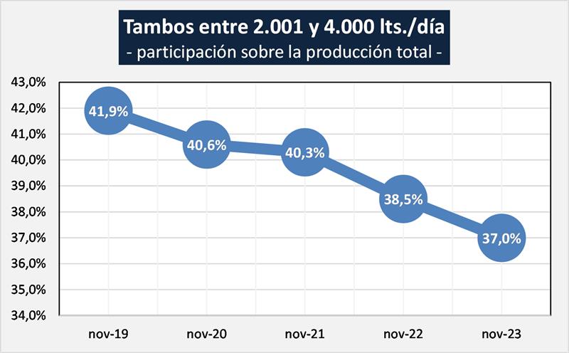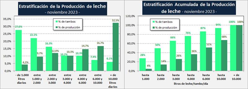 En el cuadro se presenta la participación de los tambos en función a su tamaño medido en litros de leche diarios del mes de noviembre de 2023 sobre la base SIGLeA - LUME: