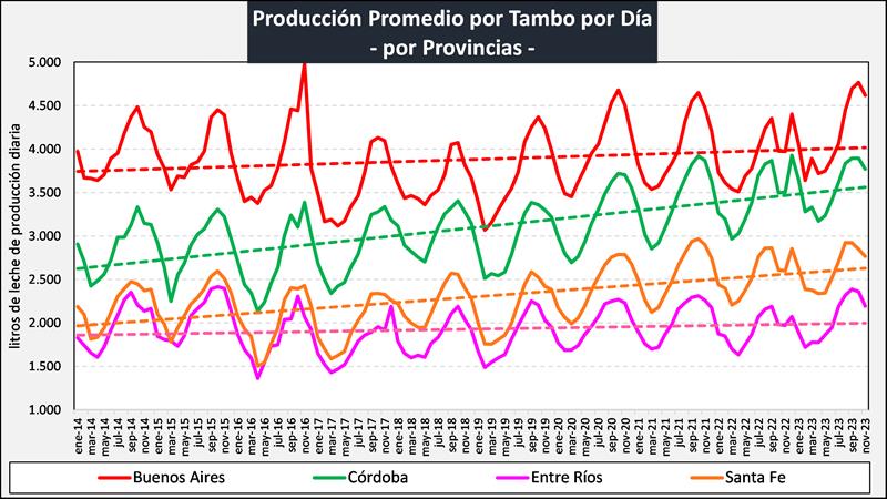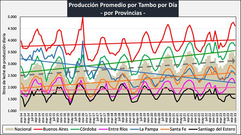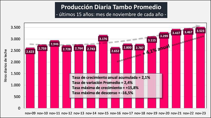Sobre la base de la producción mensual y la cantidad anual de tambos (SENASA), podemos inferir el tamaño del tambo promedio, unos 3.523 litros de leche diarios para noviembre de 2023, una producción levemente superior al año anterior +1,6%). Si evaluamos su comportamiento en el tiempo, a pesar de la disminución en el número de unidades productivas y en el número de vacas, el tambo promedio presenta en el período 2009-2023 una tasa de crecimiento acumulada anual del 2,1%, lo que permite el sostenimiento e incluso aumento de los niveles productivos agregados a nivel país.