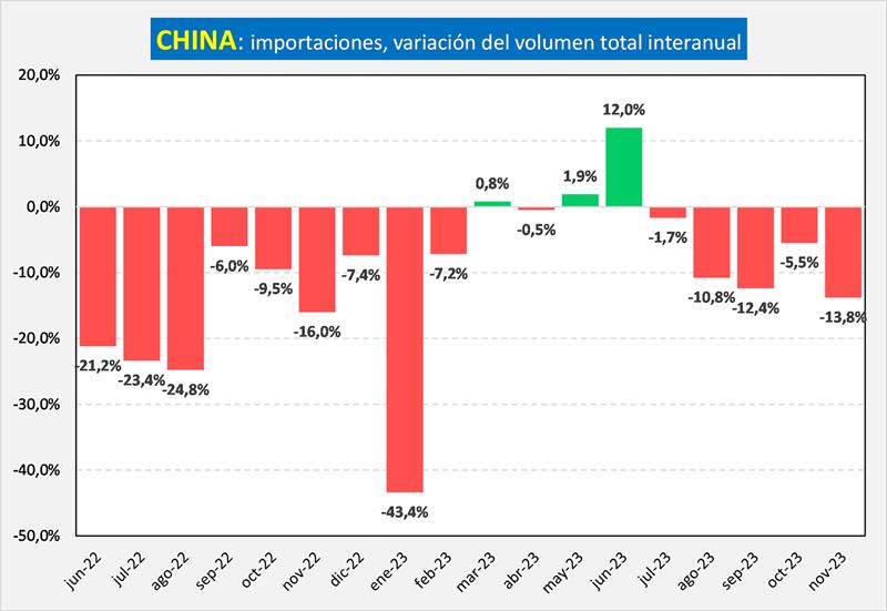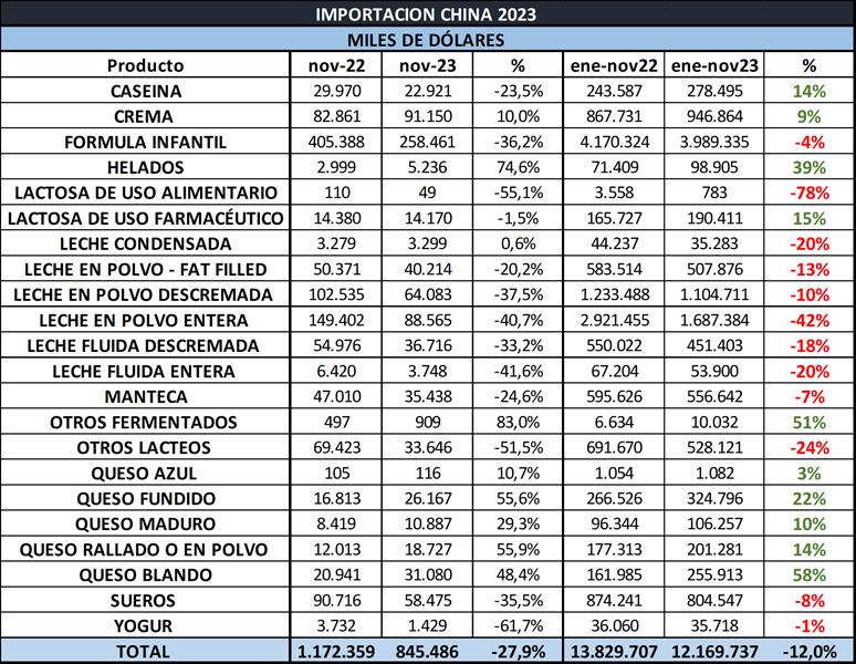 CHINA: importaciones de productos lácteos a noviembre de 2023 25/12/2023![]() Las importaciones de productos lácteos de China venían creciendo significativamente entre 2013-2021 (salvo en la crisis de 2015) a una tasa acumulativa del 10,6% anual, Y con la caída del 16,5% en 2022 la tasa se redujo al 7,2% anual. De cualquier manera, sigue siendo China el gran motor de la demanda de lácteos en el mercado internacional. ![]() En el mes de noviembre próximo pasado el volumen de productos lácteos importados por China tuvo una caída del 13,8%, contradiciendo las estimaciones que planteaban la recuperación para el segundo semestre de 2023. En litros de leche equivalentes se dio una baja también importante del 21,3%. Medidas las exportaciones en dólares hubo una fuerte baja del 27,9% debido a la caída de los precios internacionales. En el acumulado del período enero-noviembre del año, las importaciones registran una caída del 9,8% en toneladas de producto, del 19,9% en litros de leche equivalentes y del 12,0% en los valores medidos en dólares. Las compras de China en el mercado internacional ascendieron a unos 20.000 millones de litros de leche equivalentes en el año 2021, muy cercanas al 25% de lo que se comercializó en ese mercado (excluyendo las ventas intra Unión Europea), de allí que su comportamiento es muy relevante para la determinación de los precios. En el año 2022 una caída del 17,1% en las ventas mundiales en China que tiene el 25% de las compras, implicó una baja de más del 4% del total mundial, cuando este mercado sube normalmente un 3% anual. Si vemos lo que ocurrió en los 11 meses transcurridos de este año, como indicamos más arriba, las compras de China medidas en litros de leche equivalentes cayeron un 19,9%, restándole por lo tanto a la demanda mundial unos 5 puntos porcentuales, que se enfrentaron con una producción mundial creciendo en torno al +1%, lo cual representa la principal causa en la caída de precios que venimos observando en 2023. Estas bajas en las compras de China responden en principio, a una mayor producción local (ver gráfico siguiente), a altos stocks generados en las grandes compras de 2021, a las dificultades logísticas que implicaron el cierre de algunas ciudades por rebrotes de Covid, efectos colaterales de la Guerra en Ucrania y el proceso inflacionario que se viene dando en todas las economías mundiales con incidencias recesivas en la demanda. Se esperó que la situación se revierta en el segundo semestre de 2023, pero eso no se dio y la mayoría de los informes actuales de expertos no indican recuperación en inicios de 2024. ![]() ![]() En el mes de noviembre se dio una gran dispersión entre subas y bajas de importaciones, donde lo más relevante fue que todos los productos de mayor volumen (leches en polvo y fluidas) cayeron, sueros prácticamente se mantuvieron y los de menor importancia relativa, presentaron un crecimiento (quesos en general, helados, otros fermentados y cremas). En el acumulado, las compras de leche en polvo (normalmente un tercio del valor total importado), cayeron en volumen un 22,4% y 30,4% en valor. ![]() El monto total de importaciones en dólares bajó en enero-noviembre de 2023 un 12,0%, y el importe promedio pasó de US$ 4.272/ton. a US$ 4.166/ton., un 2,5% menos, por lo que la caída es principalmente por volumen importado. El Valor por Litro de Leche Equivalente de las importaciones de China en el período enero-noviembre de 2023 fue de US$ 1,00, cuando el Valor por Litro Equivalente de las exportaciones totales de Argentina a todos los destinos para igual período, fue de US$ 0,61/litro. En el gráfico siguiente se pueden observar las tasas de variación de las importaciones de productos lácteos de China, con las importantes caídas en 2022 y principios de este, producto de los factores mencionados más arriba, y la tasa levemente positiva de marzo 2023, que vuelve a tornarse levemente negativa en abril y se comienza a recuperar en mayo de 2023 y con mucha mayor fuerza en junio próximo pasado, pero que vuelve a ser algo negativa en julio y con fuerte caída en agosto y septiembre, disminuyendo la tasa de decrecimiento interanual en octubre, y una nueva caída importante en noviembre próximo pasado. ![]() China es el principal importador de Leche en Polvo Entera y su principal proveedor es Nueva Zelanda quien ostenta el 88% de participación de ese producto en el gigante asiático en lo que va de 2023, igual participación que en 2022. ![]() ![]() Informe Lácteo Global 4° trimestre de 2023 – China - Rabobank Hasta septiembre de 2023, la producción de leche de China creció un 7,2% interanual, según la Oficina Nacional de Estadísticas (BNE). Debido a este crecimiento de la producción mayor de lo esperado, Rabobank ajustó su pronóstico de producción de leche para 2023 al 6,3% interanual, con una producción total estimada en 41,8 millones de toneladas. Los precios de la leche en granja siguen siendo bajistas. Los precios promedio de la leche al productor en China continuaron disminuyendo, alcanzando CNY 3,71/kg (USD 0,51) en noviembre, un 10,3% menos interanual. El débil precio de la leche cruda sugiere un exceso de oferta continuo, debido al fuerte crecimiento de la producción interna de leche y la débil demanda. Según el último análisis de paridad de importaciones de Rabobank, los precios recientes de la WMP de Oceanía muestran un descuento del 15% con respecto al precio interno de la leche, a la par con el Promedio histórico desde 2013. Para 2024, Rabobank mantiene la opinión de que el crecimiento de la producción de leche de China se desacelerará en 2024 con un crecimiento previsto del 2% interanual. Los persistentes precios bajos de la leche en las explotaciones agrícolas y los costos de producción comparativamente elevados siguen presionando los márgenes en las explotaciones agrícolas, desalentando la producción y la inversión en el corto plazo. El I