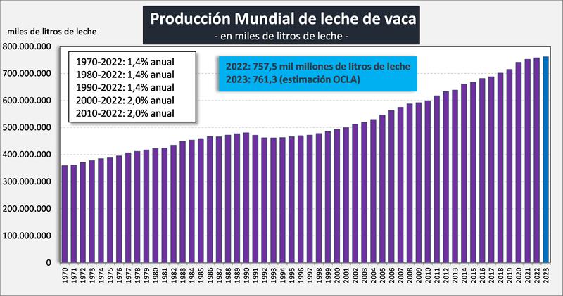 cifras de producción hasta junio/julio de 2023 de un grupo seleccionado de países productores de leche clave y teniendo en cuenta el crecimiento fuerte y constante observado en India y Pakistán en los últimos años, se espera que en general, la producción mundial de leche en 2023 pueda aumentar alrededor de un 2,1 %, igual a la tasa media de crecimiento anual durante el período 2015-2022.
