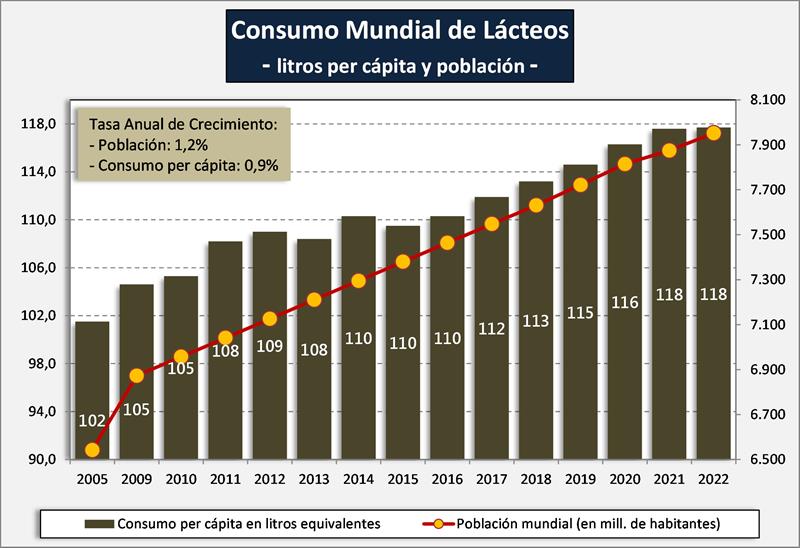 En 2022, el consumo mundial per cápita se mantuvo relativamente sin cambios en 117,7 kg (+0,1 kg) en equivalente de leche, por primera vez desde 2016, y en contraste con el crecimiento anual promedio del +1,0% observado desde 2015. Debido a que los niveles de existencias mundiales se recuperaron de sus niveles muy bajos en 2021, particularmente de manteca y LPD, el nivel mundial el consumo creció incluso menos (+0,9%) que la producción de leche. Asia es la principal región consumidora y representa el 49% del consumo, con un consumo anual per cápita de 98 kgs. que aumenta en más del 4%, todavía considerablemente por debajo de los niveles de los países occidentales. El consumo aparente de leche en la UE y los Estados Unidos se mantuvo relativamente estable.