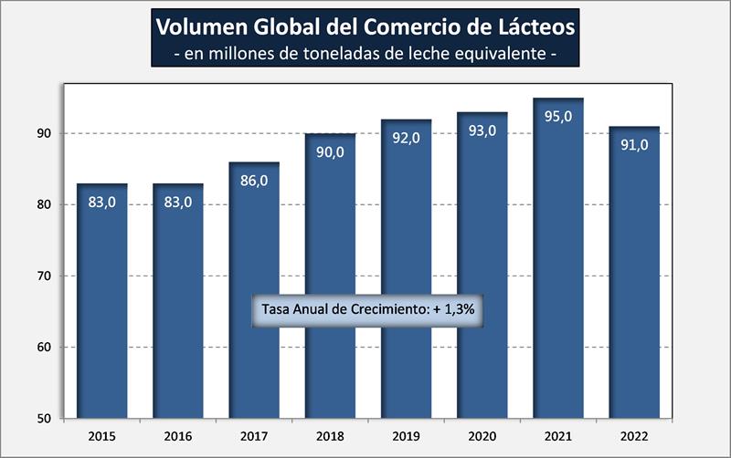 A pesar de tener la producción mundial de leche un volumen significativo, el comercio mundial de dicho producto es relativamente bajo en términos porcentuales. Se encuentra muy concentrada la oferta en pocos países/bloques y hay una cierta atomización en la demanda. Ese volumen pequeño, sumado a la alta relación que tiene con algunas variables de la economía mundial (precio del petróleo, valor del dólar, comportamiento del PBI, etc.), le dan al mercado lácteo mundial su propia característica de alta volatilidad y gran incertidumbre para todos los actores de la cadena de valor.