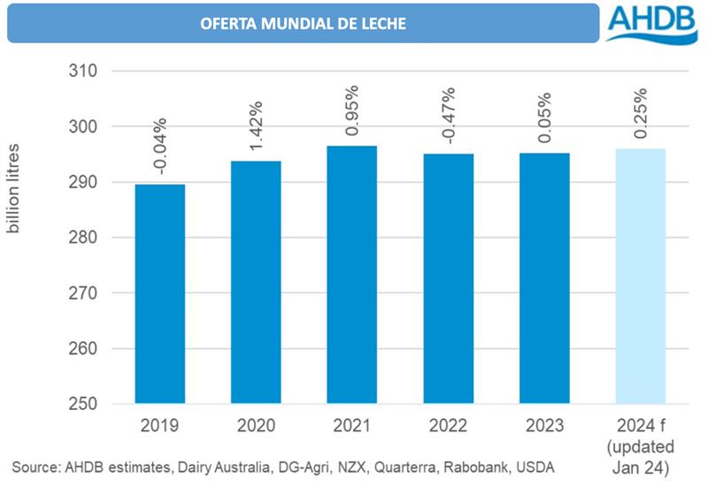 Según las últimas estimaciones, se espera que la producción mundial de leche en las principales regiones productoras crezca modestamente en un 0,25 % en 2024. Esto es ligeramente superior al aumento del 0,05 % registrado en 2023. Aunque es probable que la producción aumente, se espera que haya variabilidad entre las regiones clave.