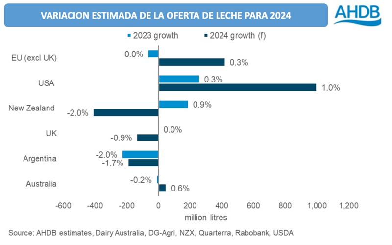 Por otro lado, se espera que las condiciones climáticas volátiles, junto con el debilitamiento de la demanda de los consumidores, reduzcan la producción en Argentina. En Nueva Zelanda, el nuevo presupuesto conservador del gobierno significará un enfoque cauteloso para la agricultura y esto afectará a los flujos de leche durante la temporada. En el Reino Unido, se estima que la producción para 2024 es un 0,9 % más baja, dados los márgenes de reducción y la tibia demanda de los consumidores.