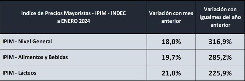 Índice de Precios Internos Mayoristas – IPIM – Lácteos – enero 2024 19/2/2024