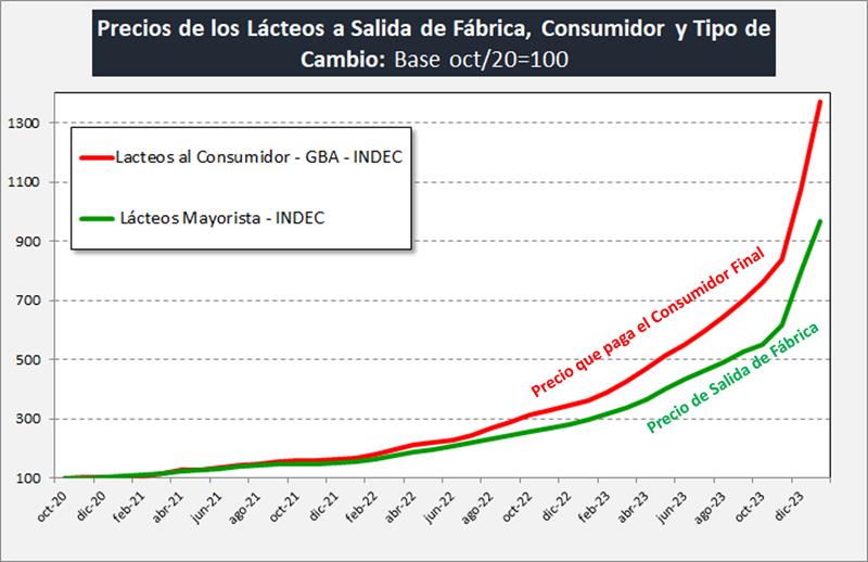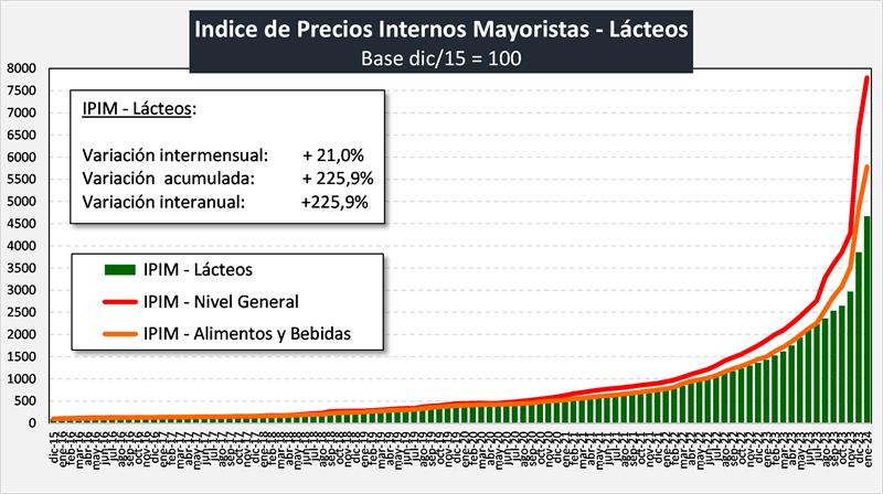 El índice mayorista de precios de los Lácteos registró un aumento de 21,0% en enero de 2024 respecto del mes anterior, y la comparación anual con enero de 2023 arrojó un incremento del 225,9%.