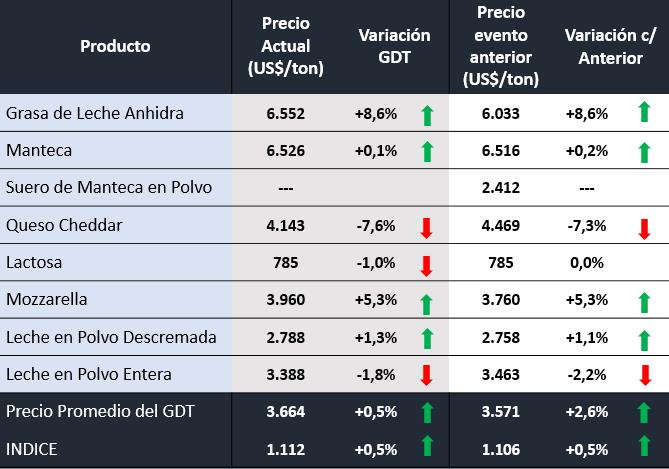 -GDT Price Index indica el promedio del cambio porcentual en los precios para cada especificación, ponderado por la cantidad de cada especificación vendida. GDT proporciona un cambio en el índice de precios de GDT del evento anterior para todos los productos, además de un equivalente para cada grupo de productos y cada combinación de grupo de productos/período de contrato. El índice de precios proporciona un reflejo más preciso de los movimientos de precios entre los eventos comerciales.