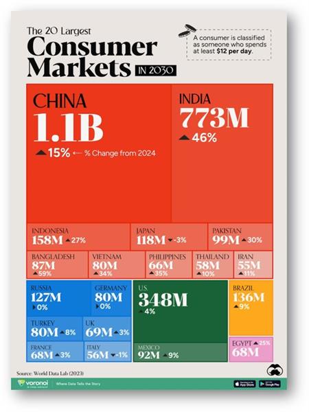 Según las proyecciones del World Data Lab basadas en el análisis de datos de entidades como el Banco Mundial, la ONU, Eurostat, la OCDE, en 2030 el mayor mercado será China, que tendrá más de mil millones de consumidores, con un aumento del 15% respecto a 2024. India ocupa el segundo lugar, con 773 millones de consumidores, pero creciendo hasta un 46% frente a los 529 millones actuales. Aquí se clasifican como "consumidores" aquellos que tienen una capacidad de gasto diario superior a los 12 dólares.
