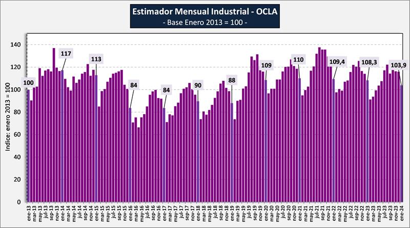 El EMI-OCLA ascendió a 103,9 en enero de 2024, valor 10,3% inferior al mes anterior, y cayó el 4,1% respecto a igual mes del año anterior, 8,5 puntos menos que la caída en la producción, con lo cual los precios mejoraron significativamente en moneda constante.